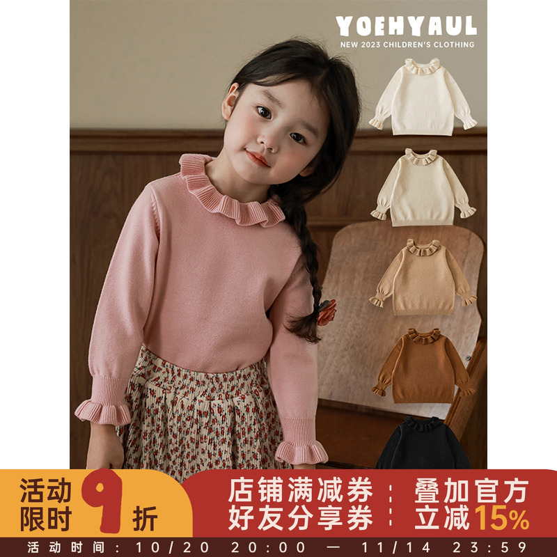 女童打底衫冬装2025新款洋气儿童百搭纯色花边领针织衫小女孩毛衣