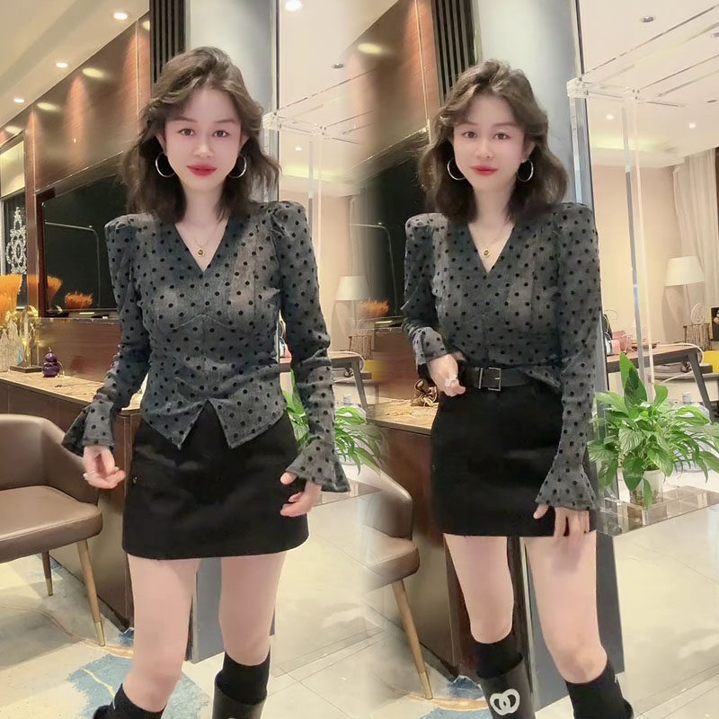 2025秋季新款法式气质喇叭袖波点V领长袖T恤女时尚百搭显瘦打底衫