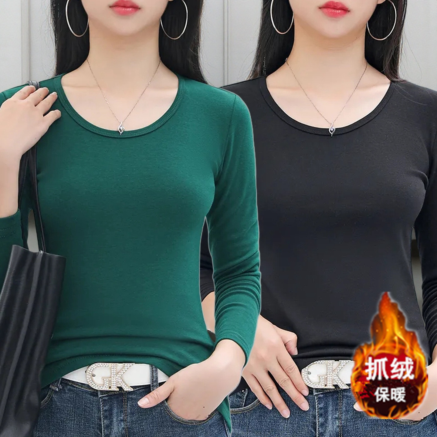 秋冬打底衫圆领加绒长袖t恤女黑色白色法式内搭修身显瘦保暖秋衣