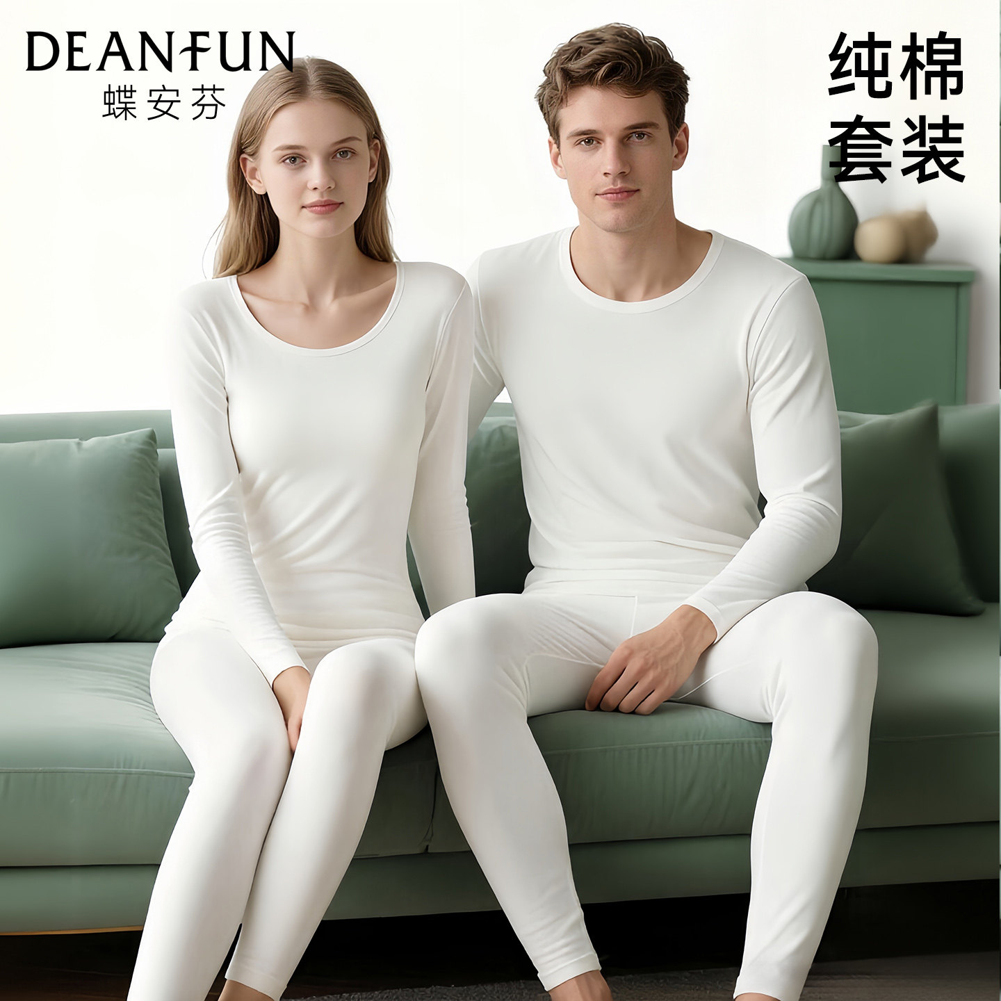 蝶安芬男纯棉秋衣秋裤套装女士白色圆领保暖内衣秋冬季薄款打底衫