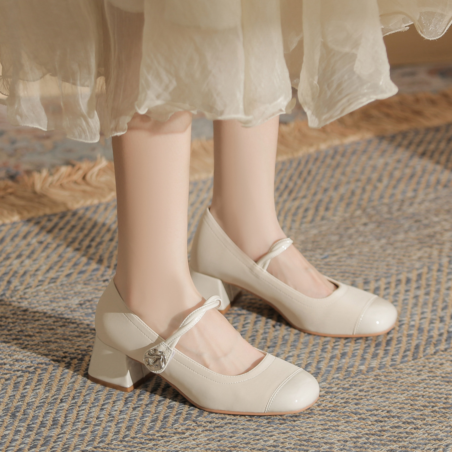 羊皮~法式方头单鞋女春季绝美芭蕾鞋复古一字扣粗跟旗袍玛丽珍鞋