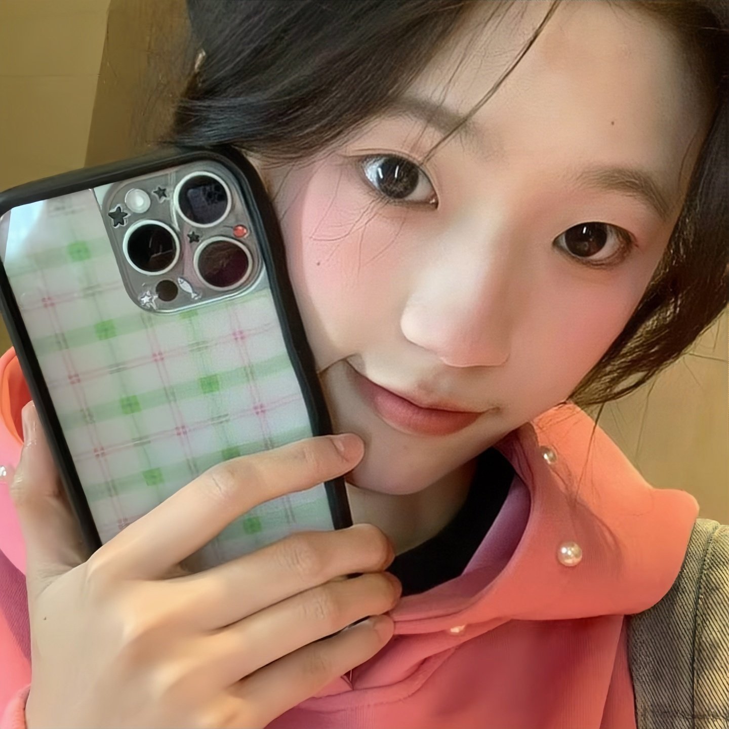 轻派日韩少女粉色格子猫咪挂饰适用苹果17promax手机壳iphone16pro新款15女款14银色边框13卡通可爱全包硬壳