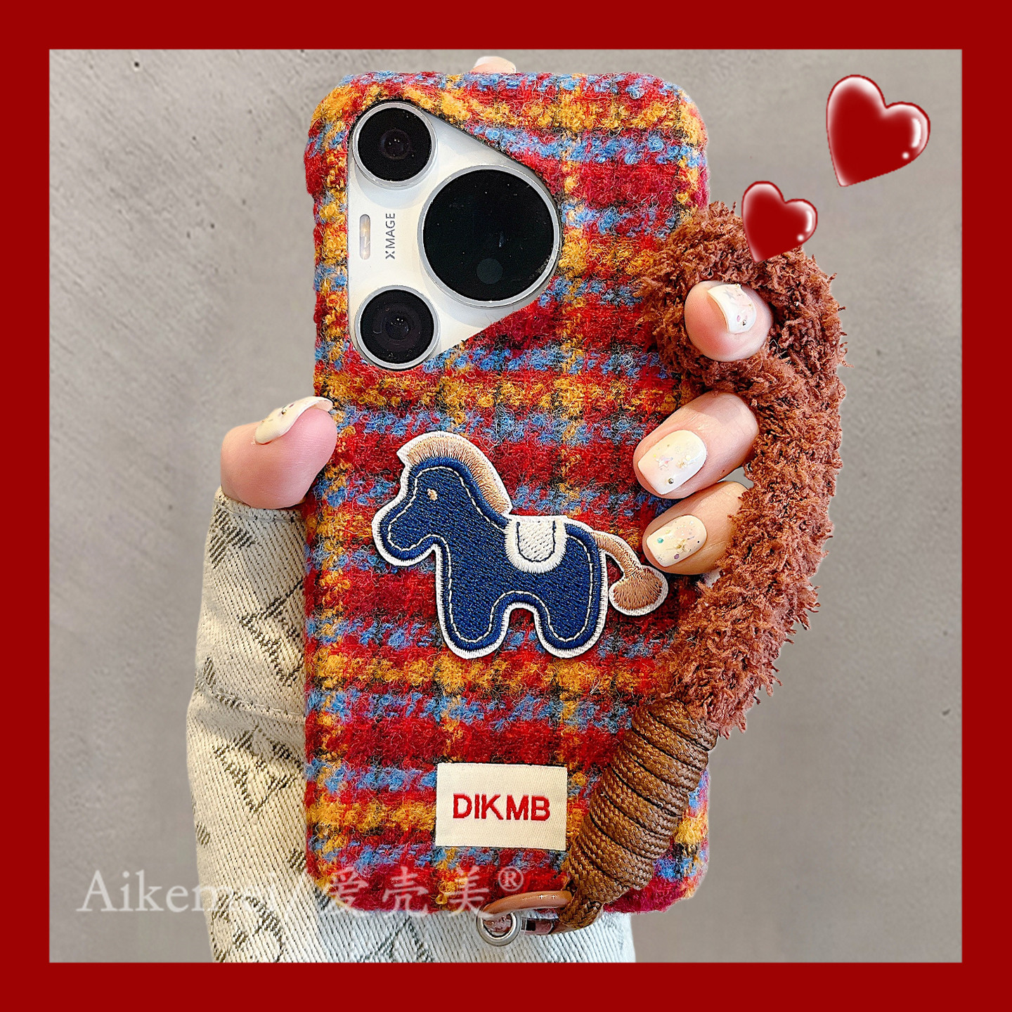 适用华为pura80pro+手机壳秋冬款撞色绒布彩色格子刺绣小马Pura70pro毛绒挂绳p8070防摔女款mate70pro+保护套