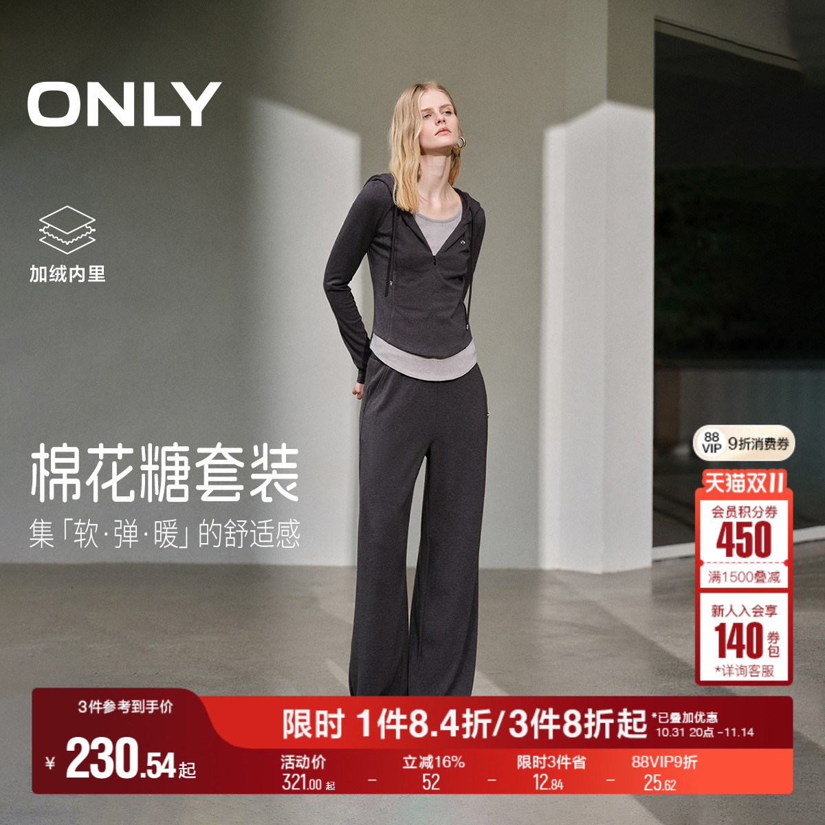 【棉花糖套装】ONLY2025冬季新款加绒修身假两件连帽卫衣休闲裤女