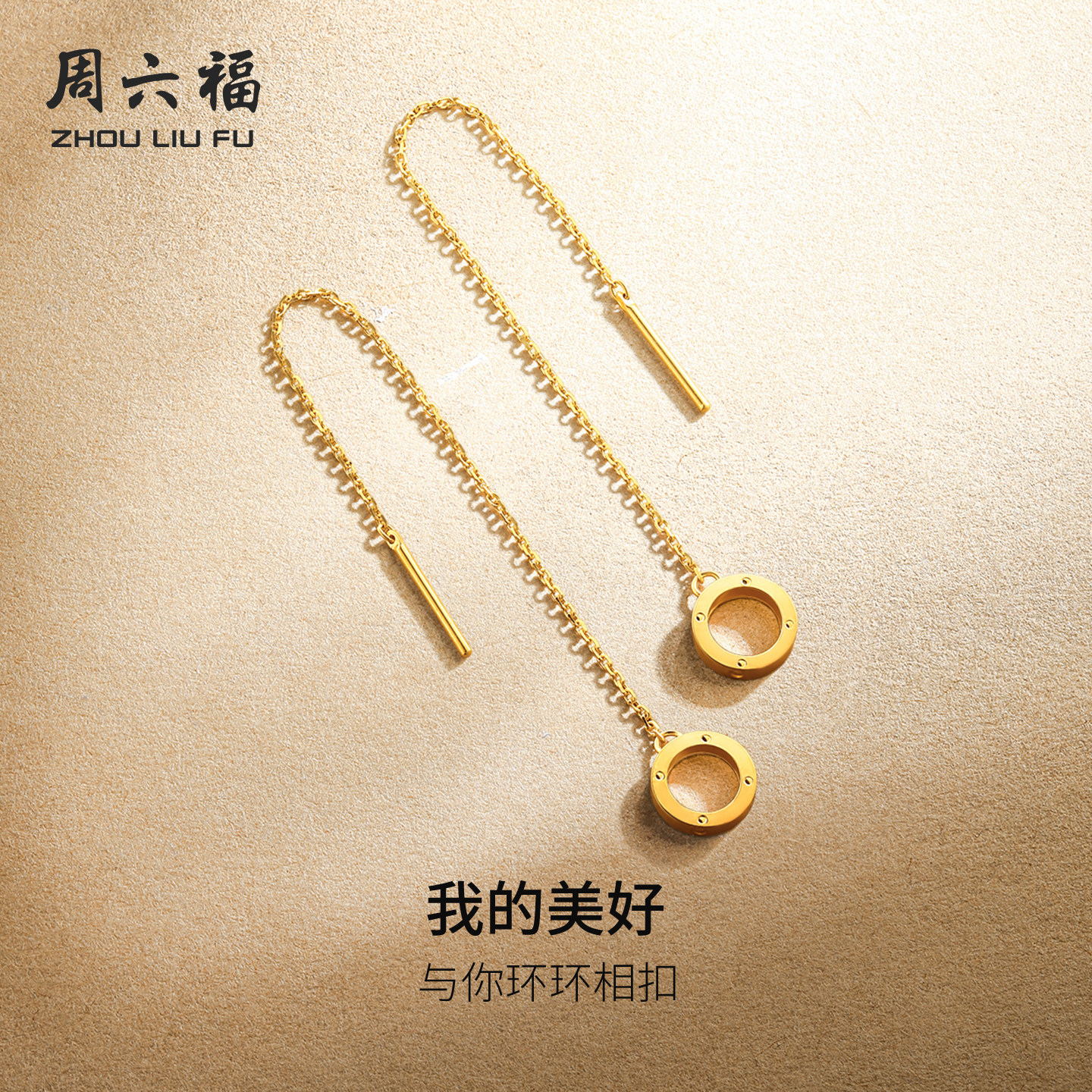 周六福18K金耳饰女耳线长款环环相扣多双环au750彩金女神节礼物