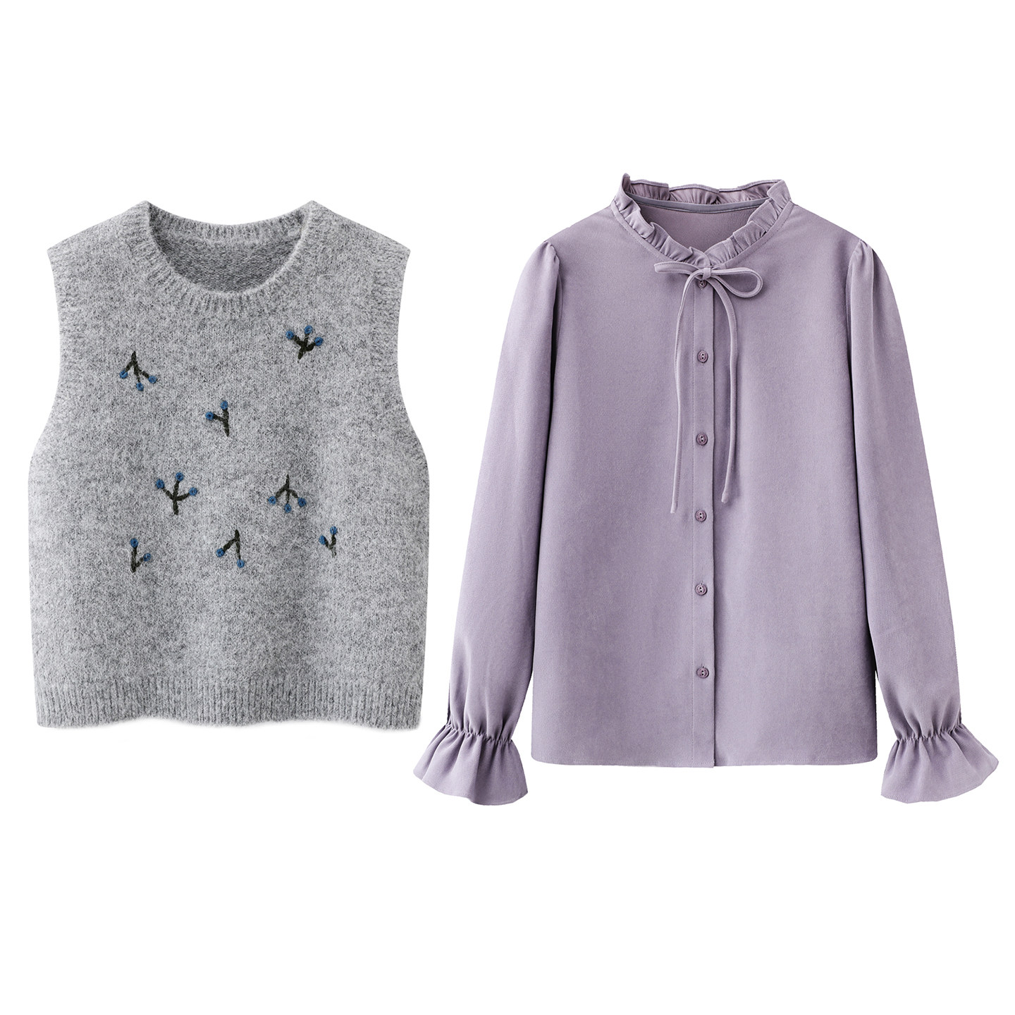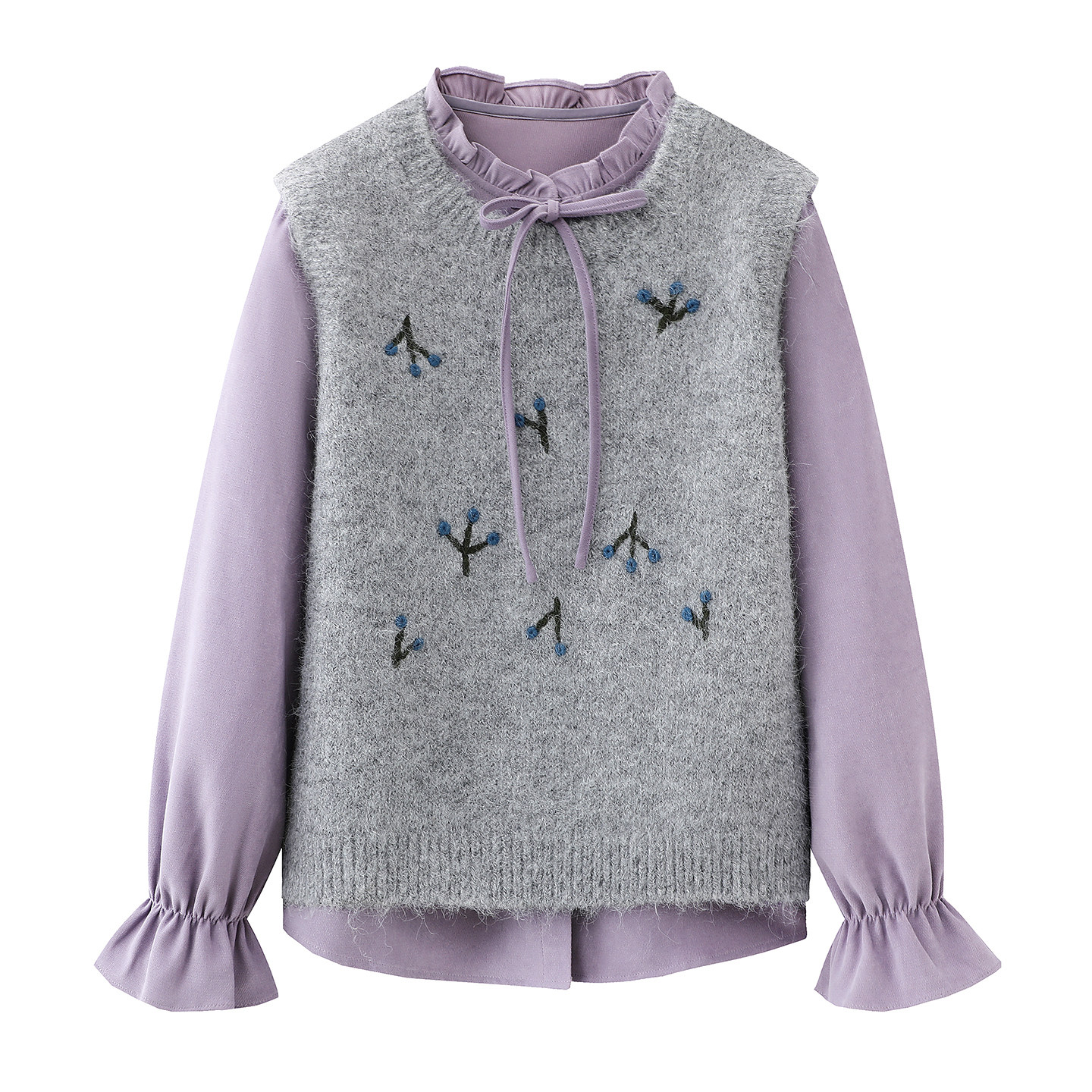 熙+の紫色衬衫叠穿针织马甲套装女2026年春季新款毛衣背心两件套
