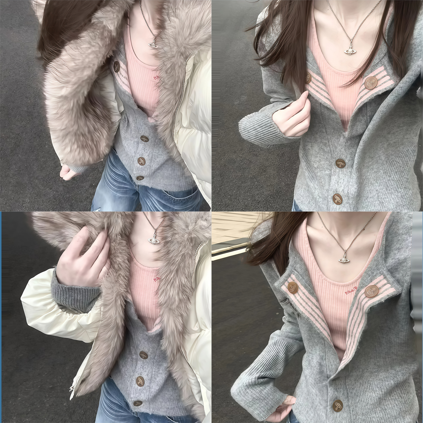 法式软糯小香风毛茸茸保暖马甲背心开衫搭配粉色拉链毛衣两件套装