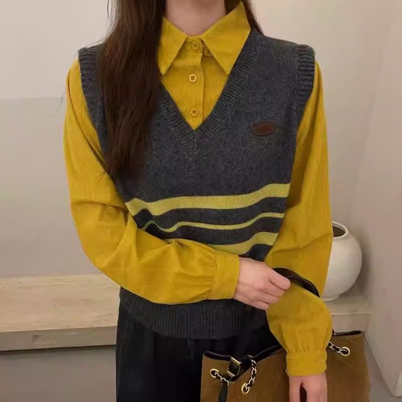 欧韩女装【衬衣+毛衣背心两件套】轻奢学院减龄风无袖背心马夹牛