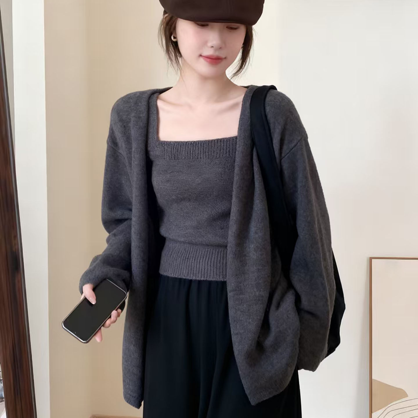 韩版温柔风宽松针织开衫吊带背心两件套秋冬新品温柔减龄洋气毛衣