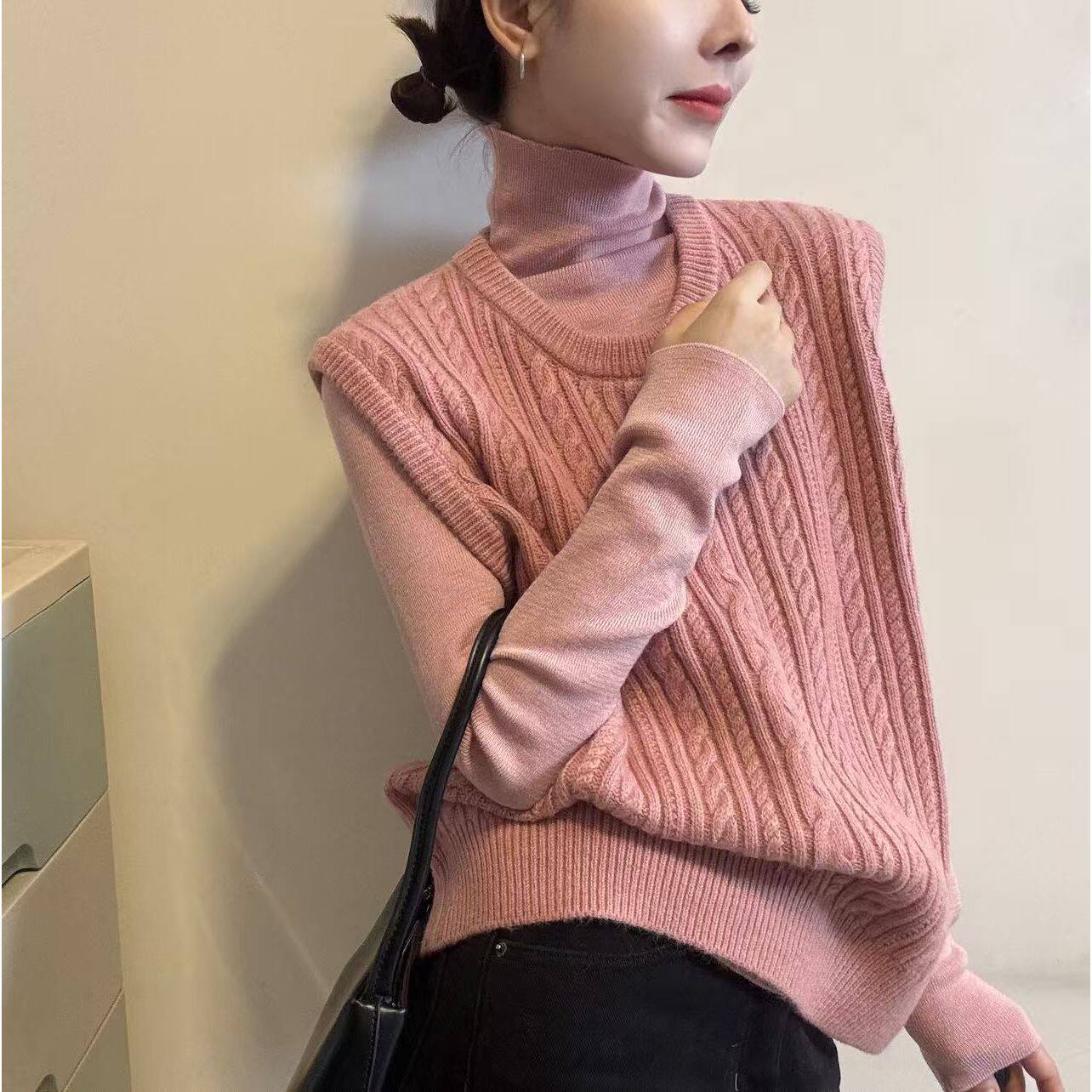 BADX正品纯色圆领无袖针织马甲女25冬季高领打底衫毛衣背心两件套