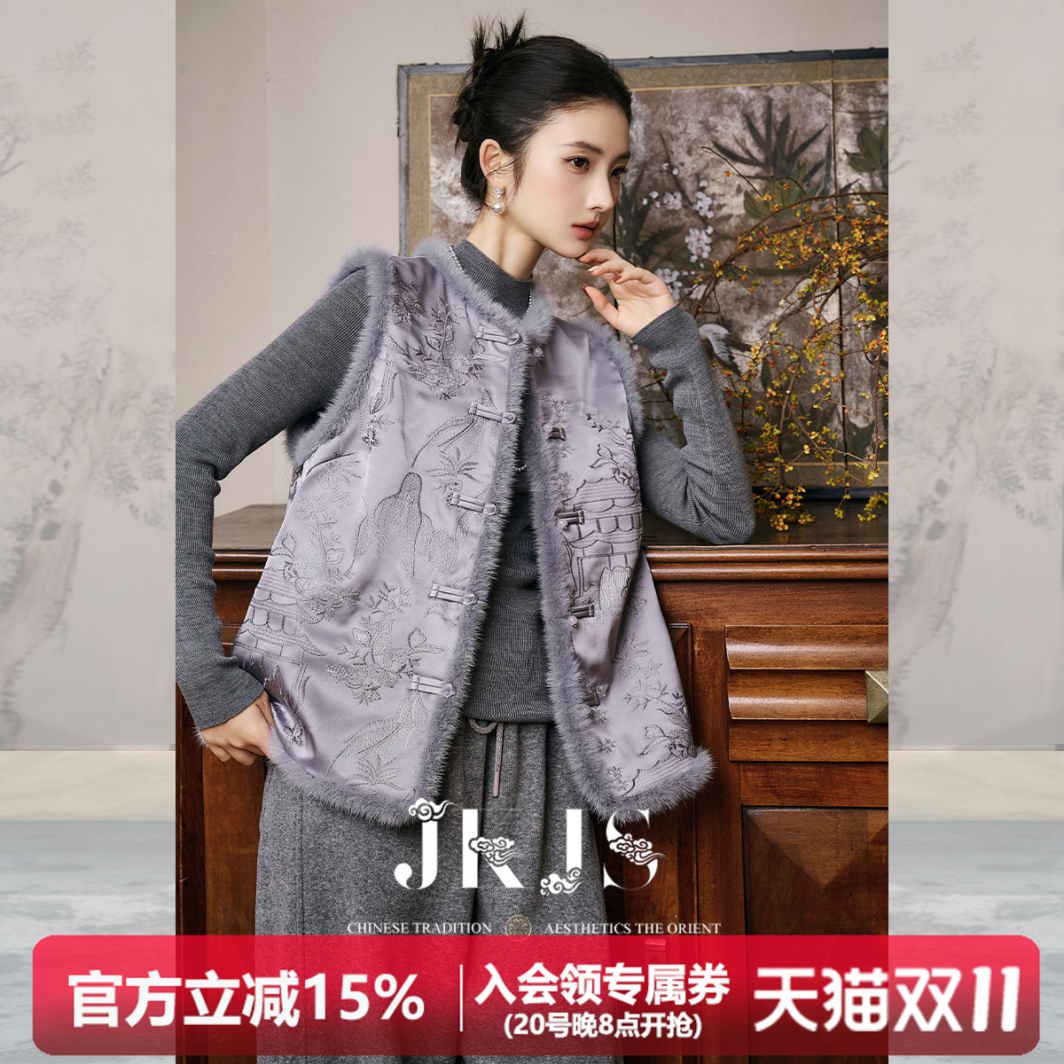 JKJS 水貂毛 国风新中式棉马甲外穿冬季夹棉外套对襟上衣刺绣马夹