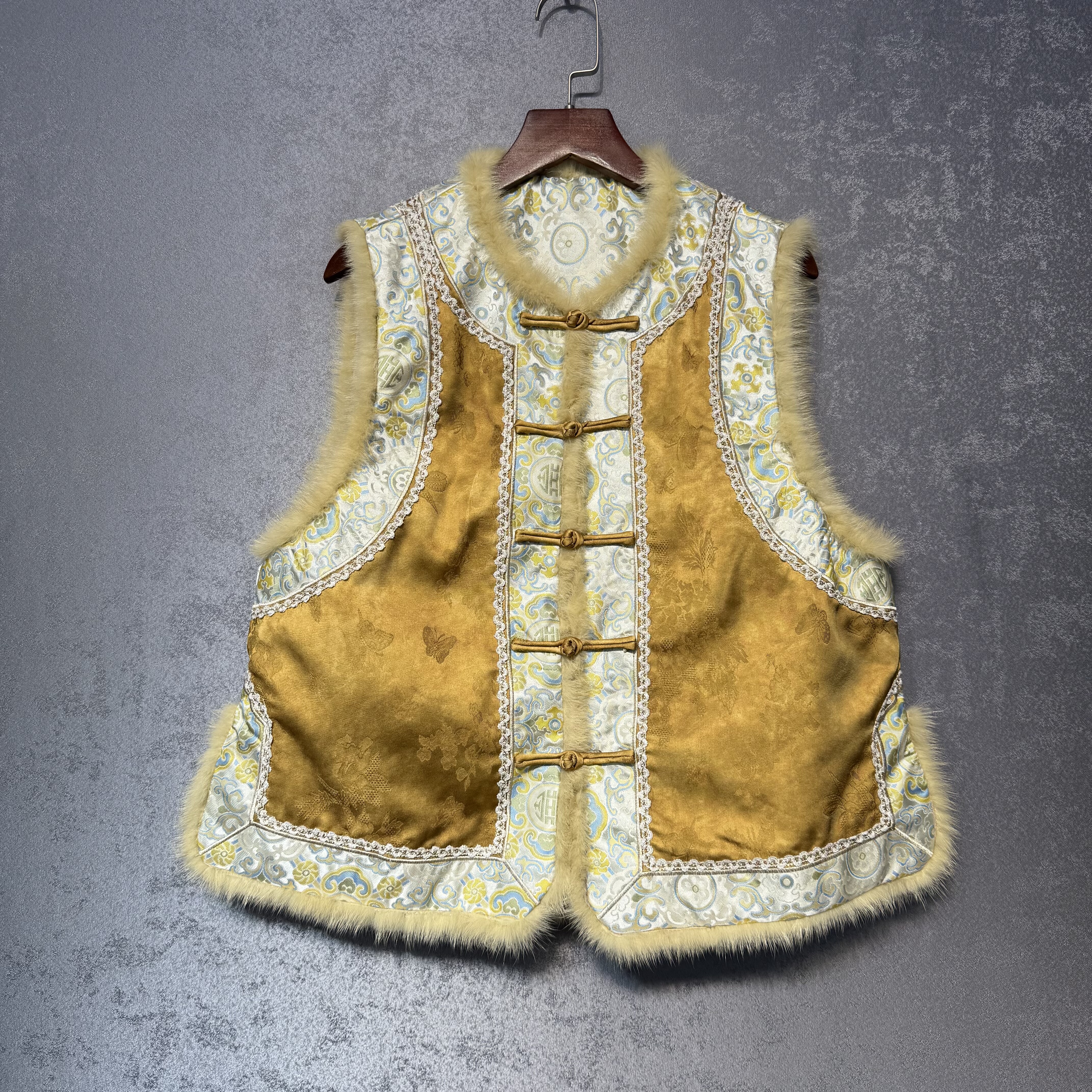 新中式国风双面穿织锦水貂毛马甲圆领珠扣暗纹提花复古气质坎肩女