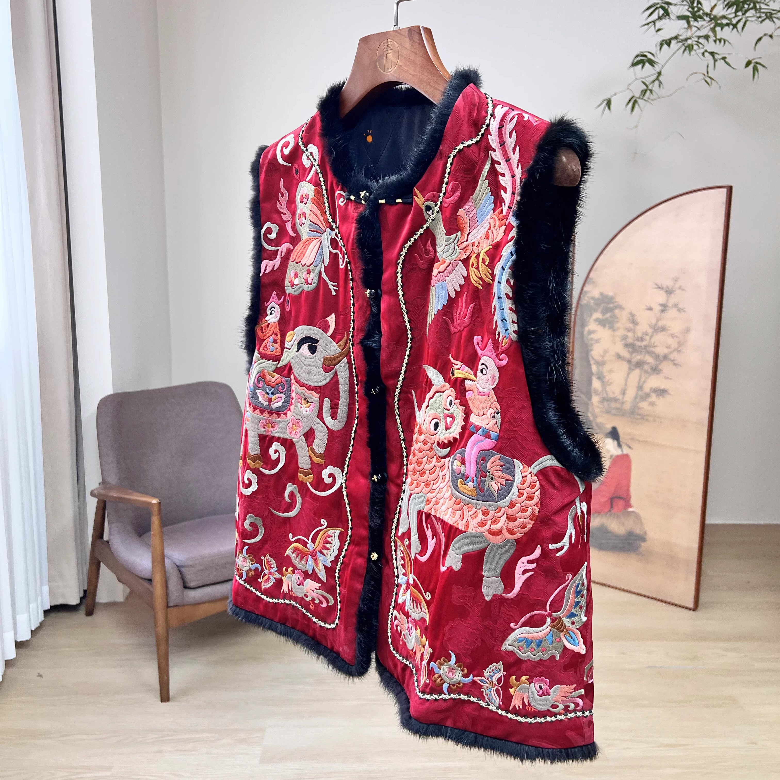 拉贝碧【买一送一】庆丰年 新中式 重工刺绣双面穿夹棉水貂毛马甲