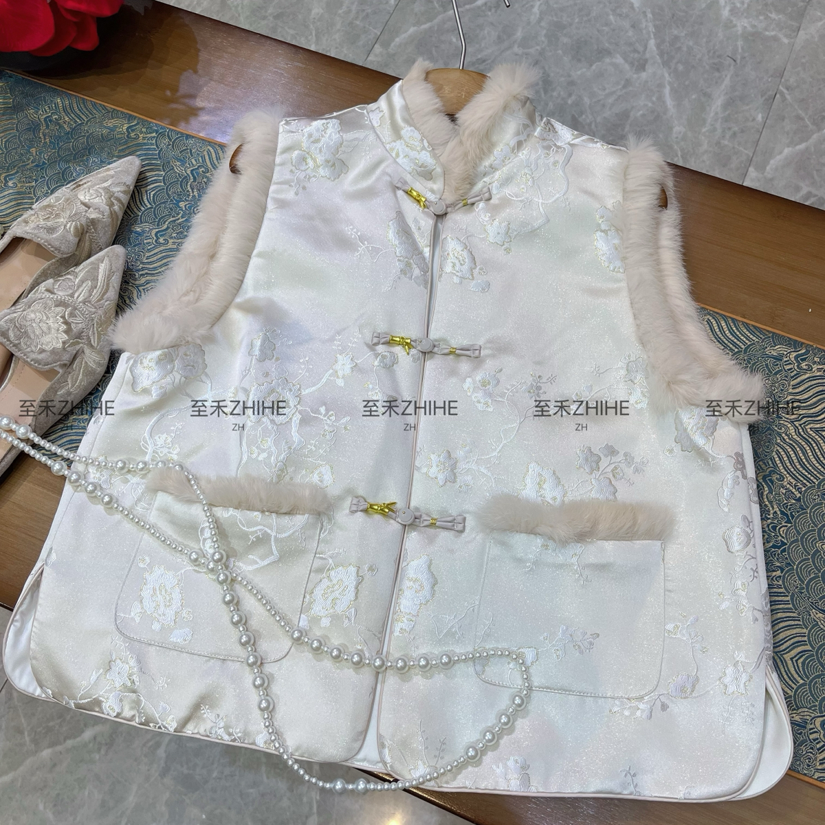 小雪家【天使香颂】新中式圆领浅色系刺绣醋酸夹棉拼接水貂毛马甲