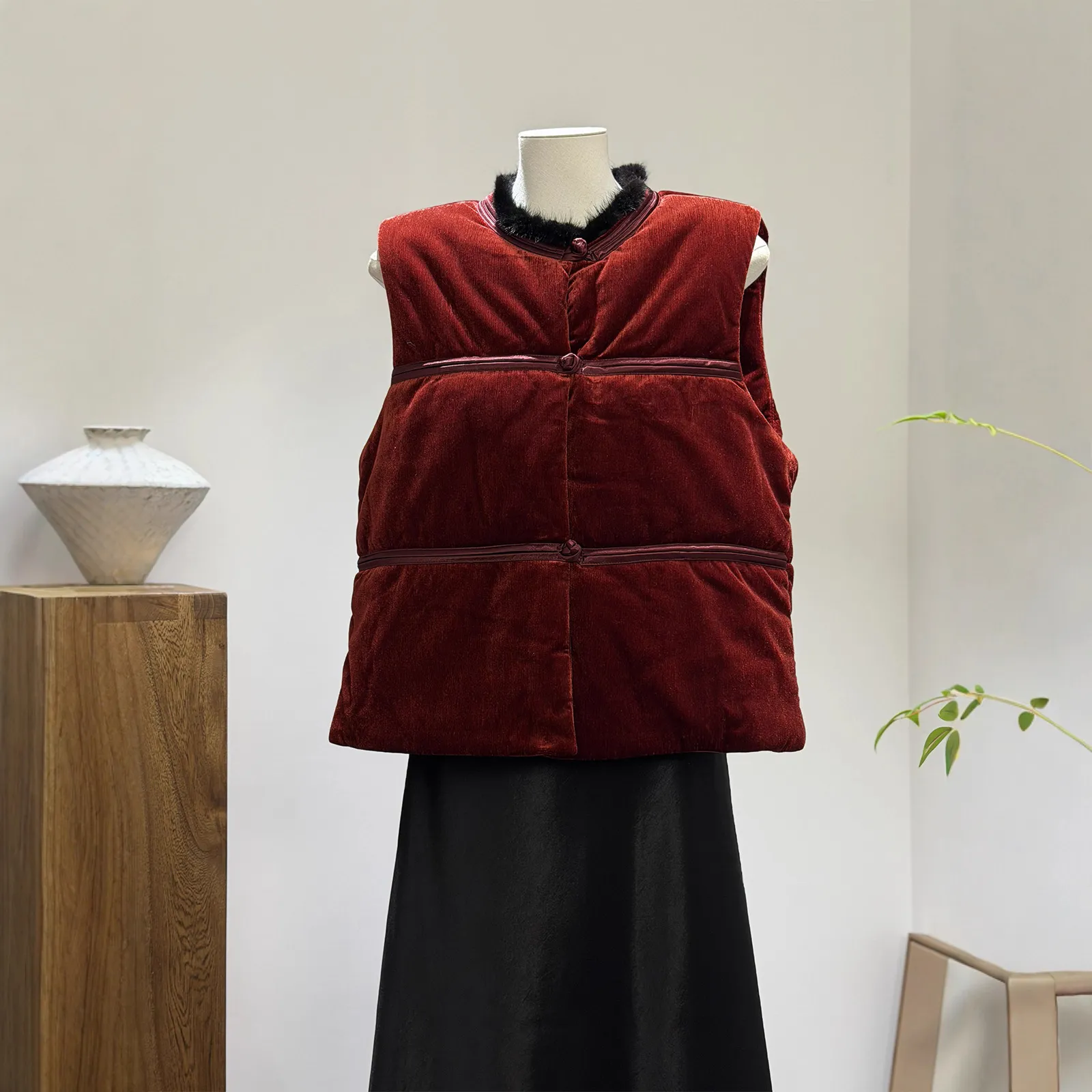 新中式国风盘扣提花貂毛马甲女2025秋季新款覆古气质坎肩夹棉背心