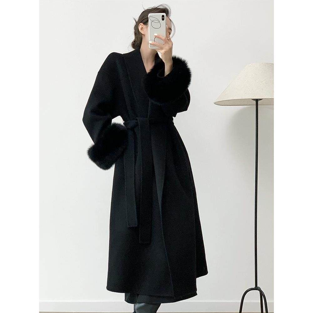 黑色真狐狸毛双面羊绒大衣女韩版25冬季新款赫本风高级感呢子外套