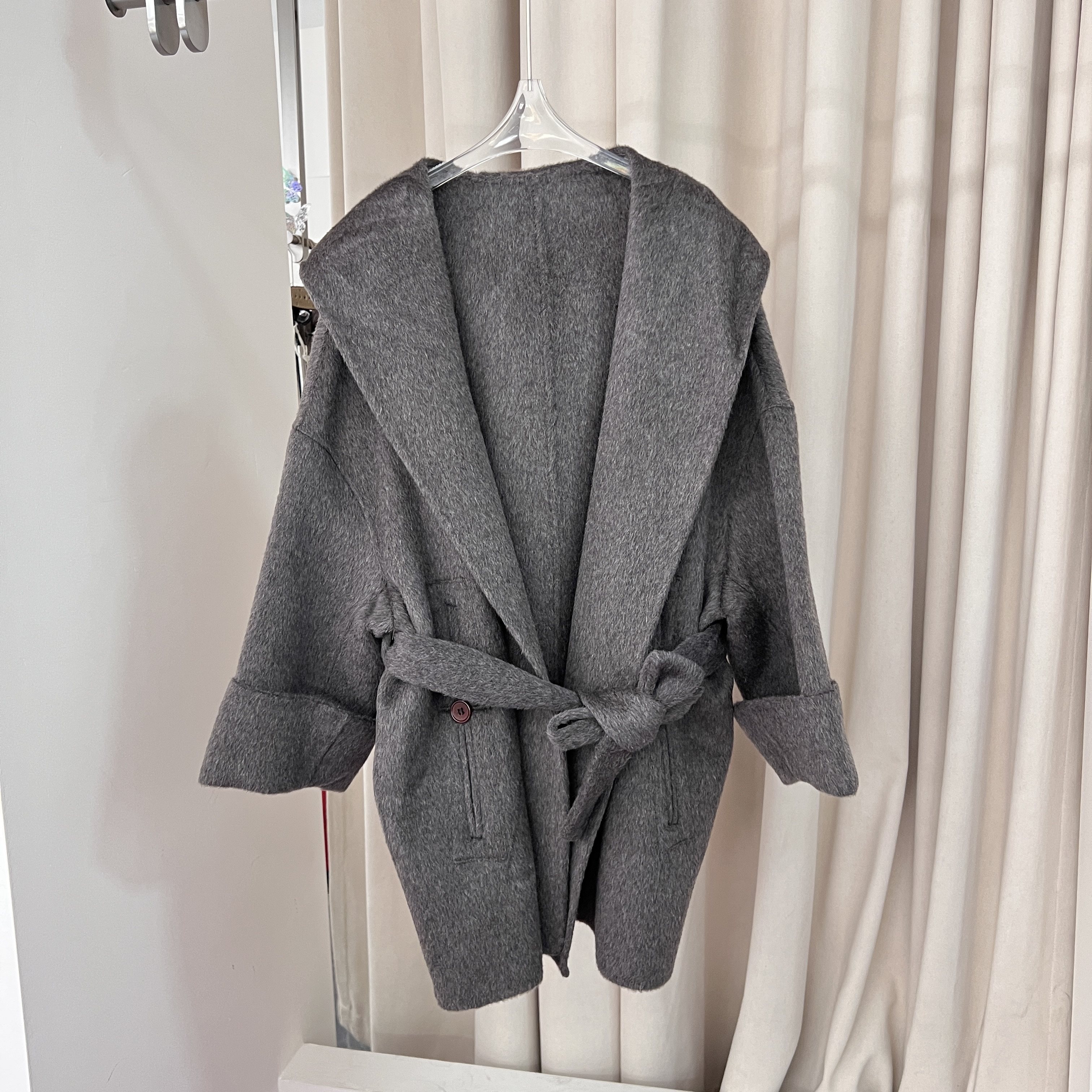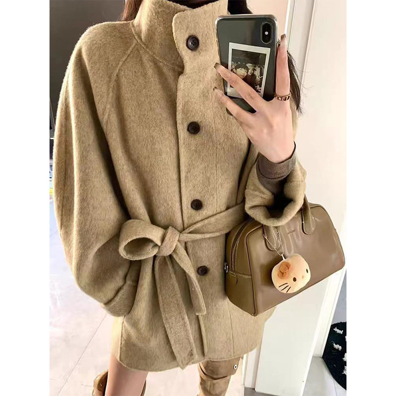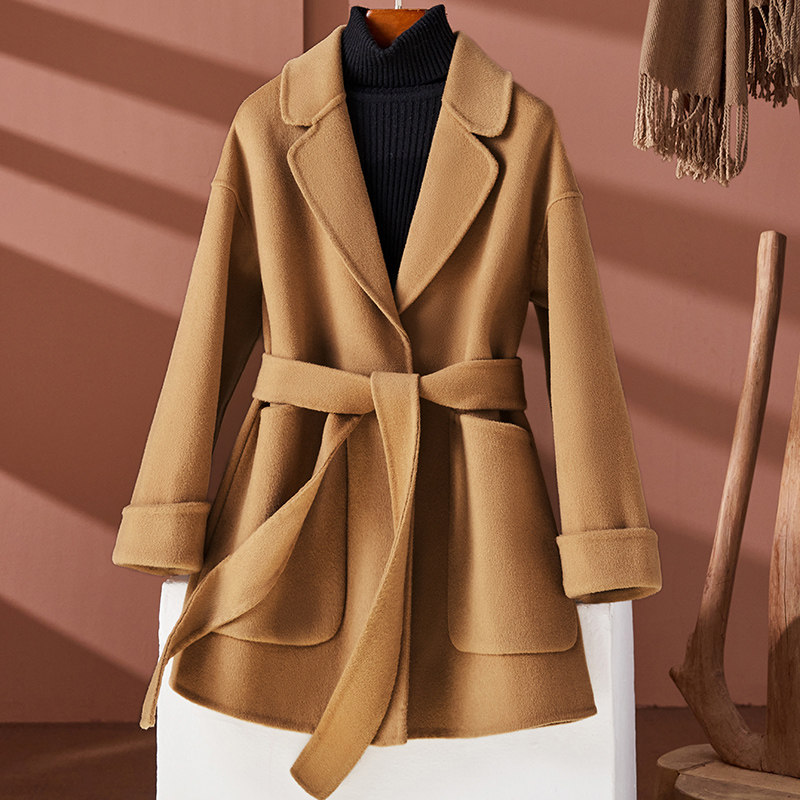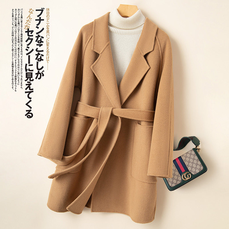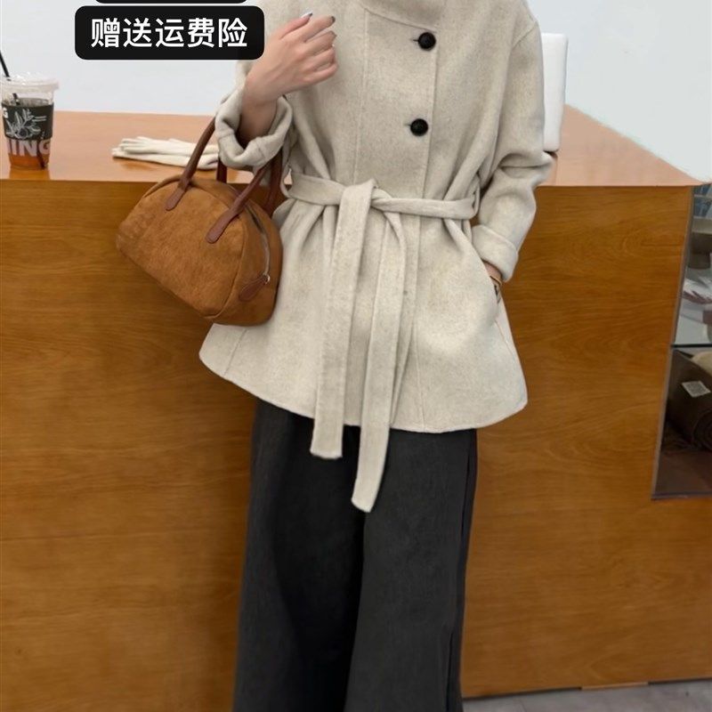 2024年秋季新款立领双面羊绒大衣女韩版A型系带裙摆式羊毛外套短