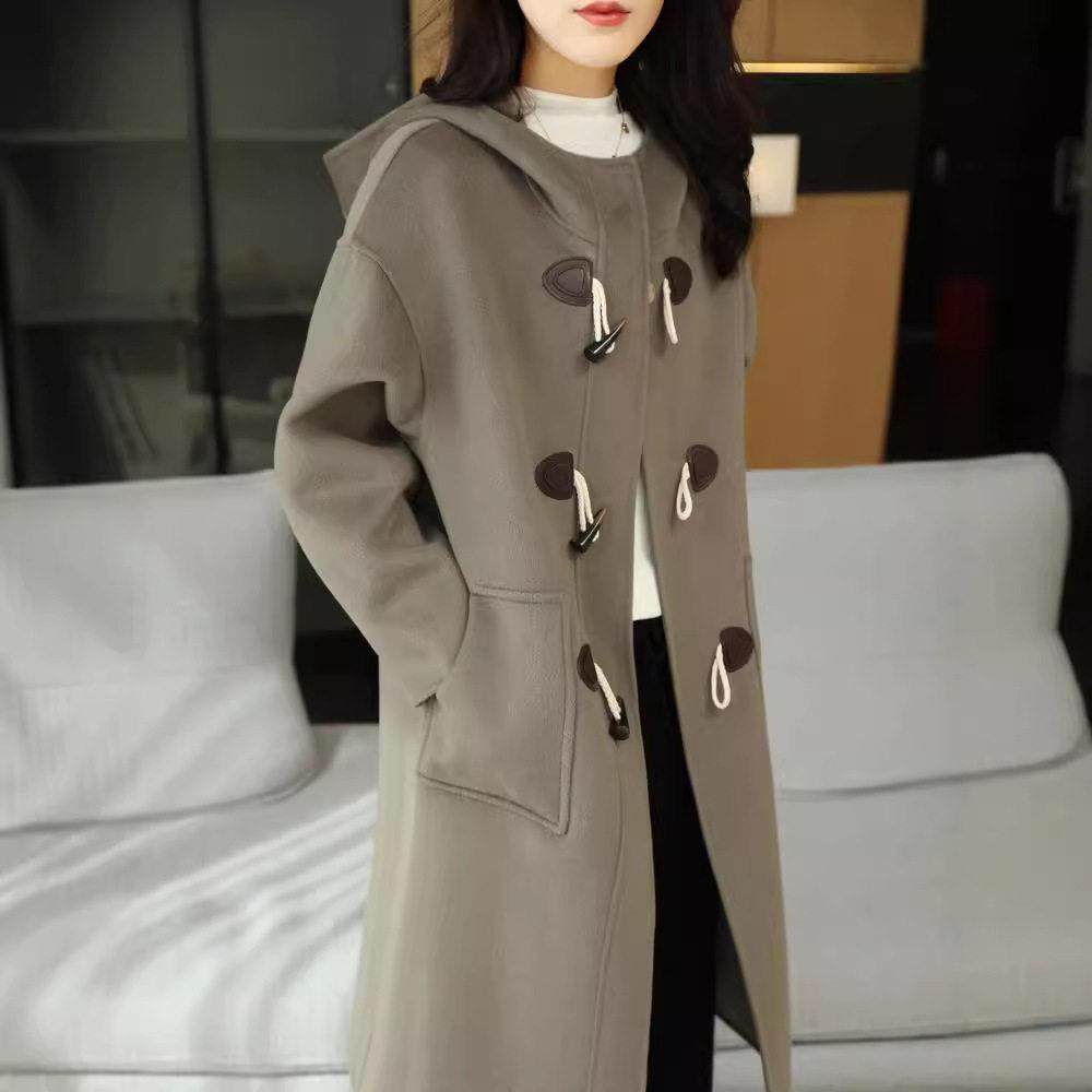 2024时尚朗姿秋冬新款连帽双面羊绒大衣女韩版宽松加厚毛呢外套潮