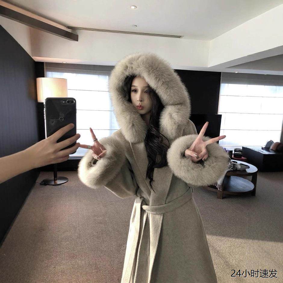 Queen高品质~25秋冬新款狐狸毛领连帽双面羊绒大衣女韩版毛呢皮草