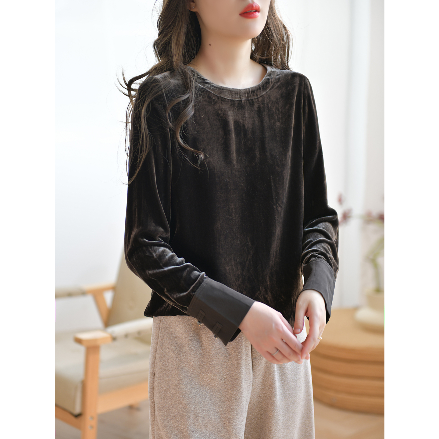 GESGOO知性雅韵金丝绒上衣女士长袖秋季2025新款法式真丝衬衫圆领
