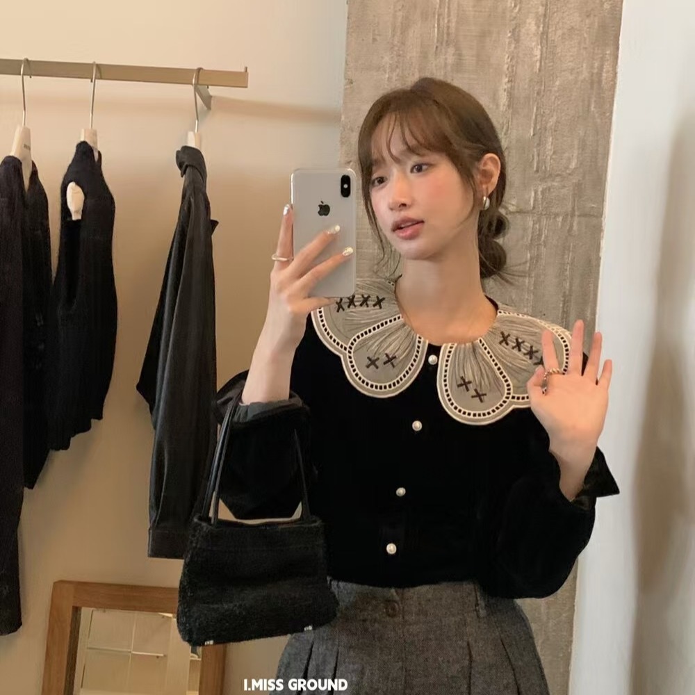 欧货气质金丝绒衬衫女24秋冬洋气钉珠POLO领长袖设计感收腰打底衫