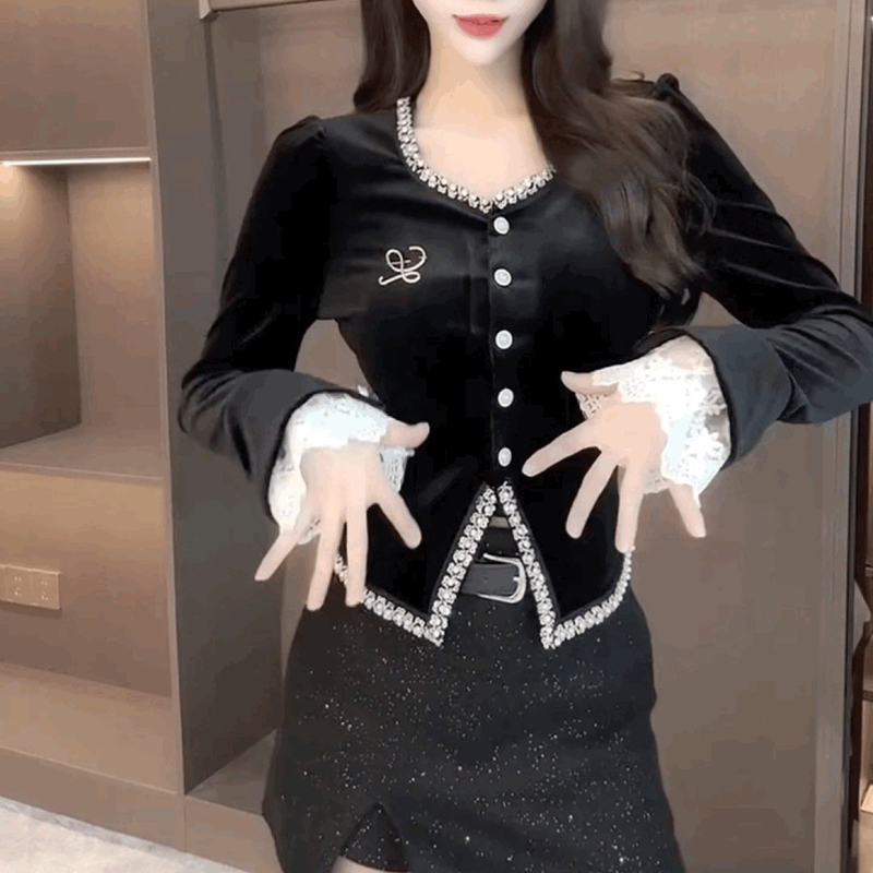金丝绒打底衫女洋气秋冬设计感小众蕾丝上衣内搭黑色保暖衬衫女冬