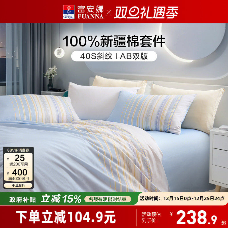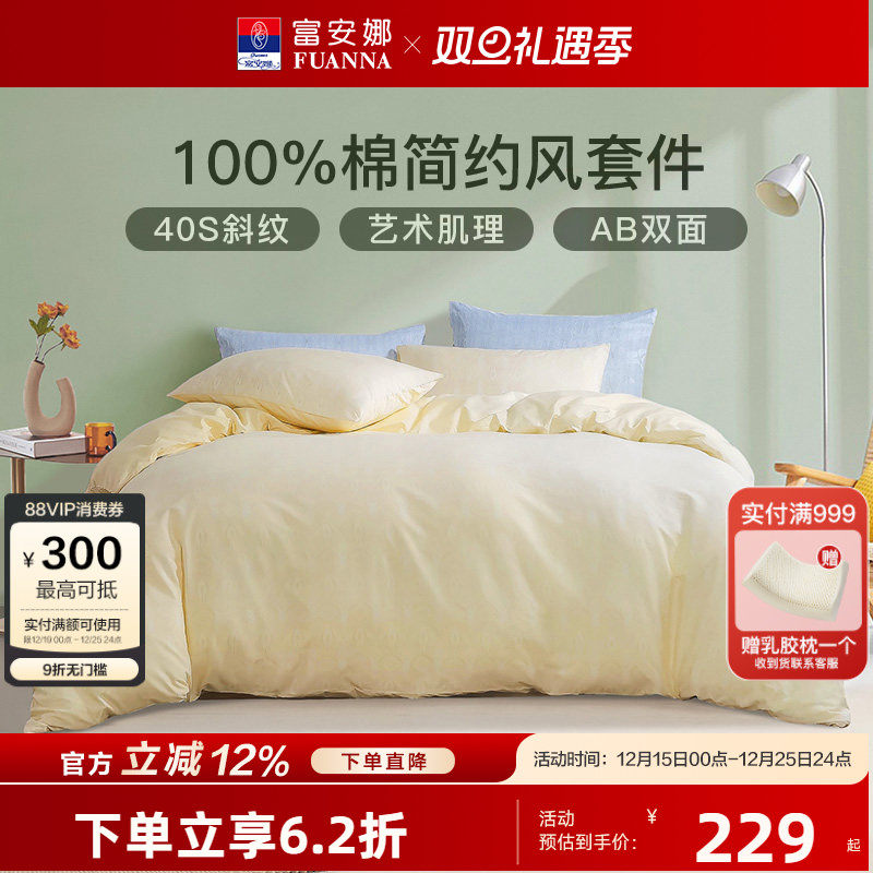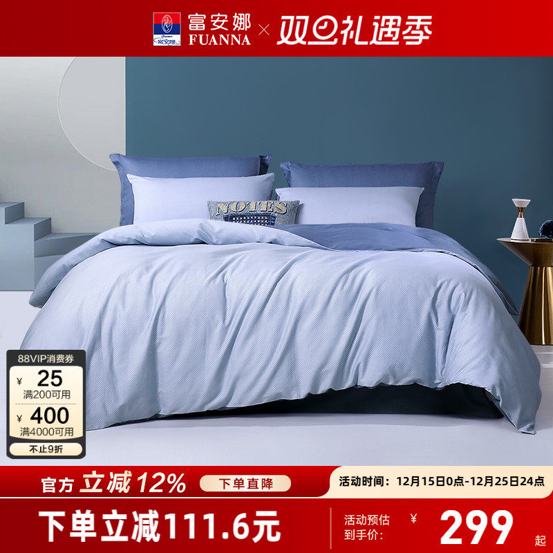 富安娜家纺全棉100纯棉床上四件套床单被套三件套中性简约风床品