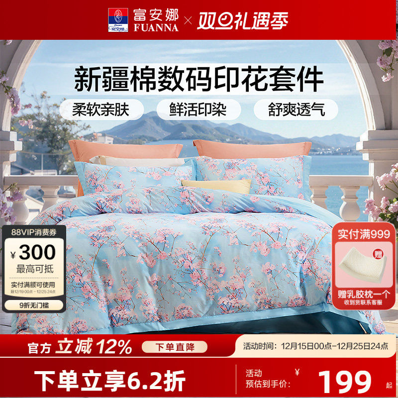 富安娜纯棉100床上四件套全棉床单被套秋冬新品旗舰店床上用品