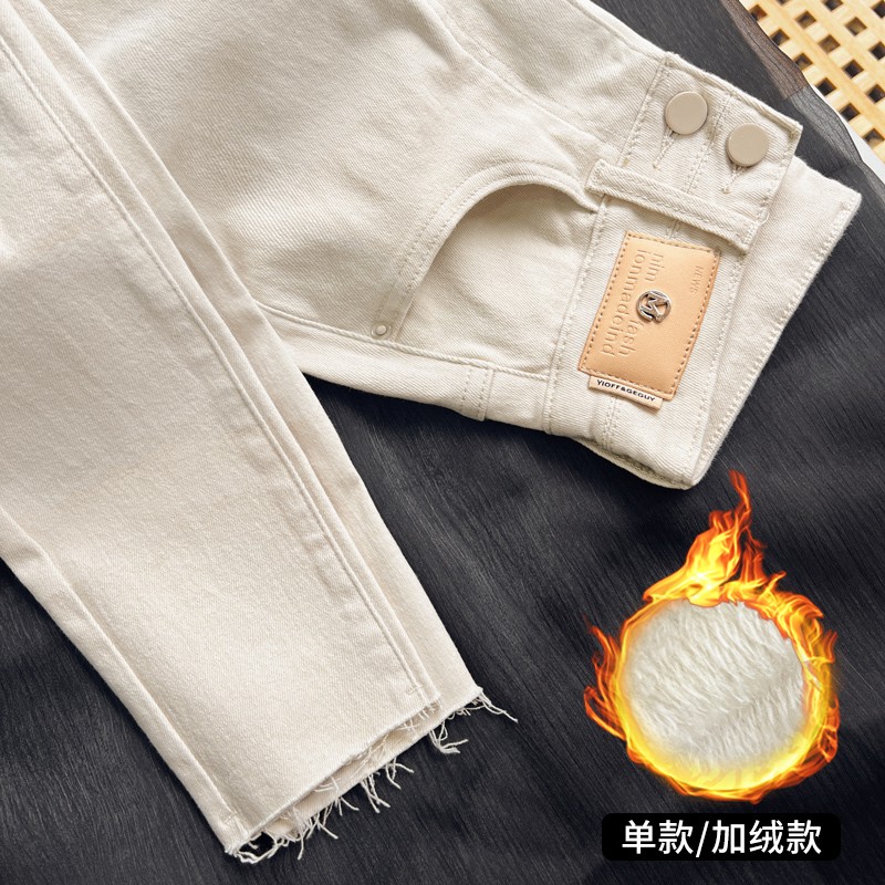 【百搭小白裤】米白色加绒牛仔裤女秋冬款高腰毛边显瘦紧身小脚裤