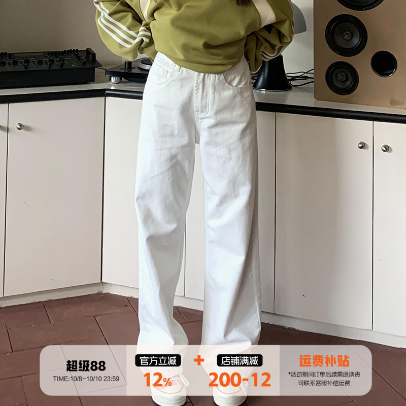 橘子树在哪儿白色复古直筒牛仔裤女春季款高腰宽松垂感拖地阔腿裤