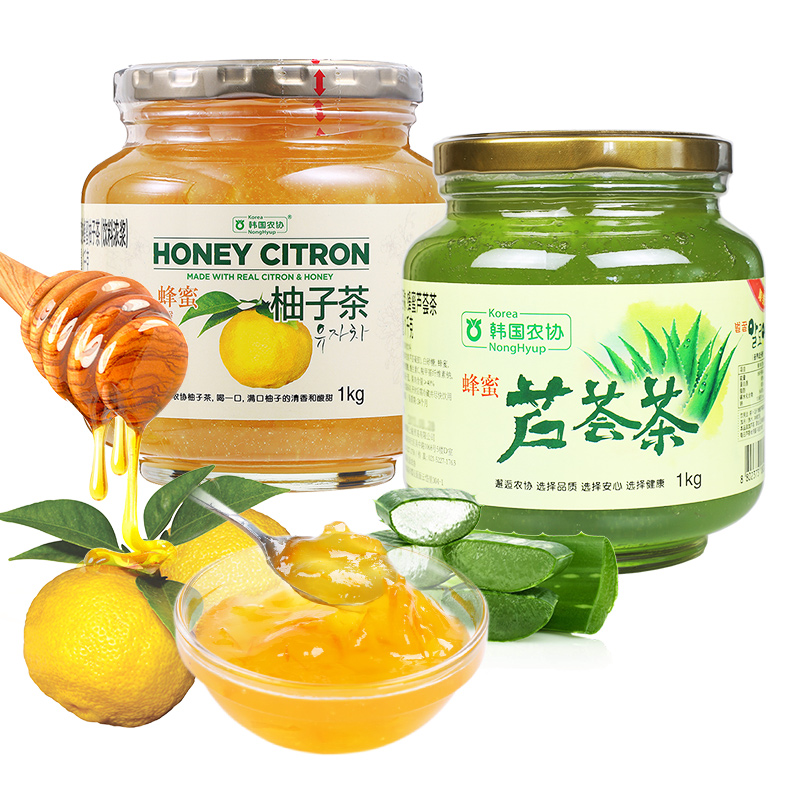 原装进口韩国农协新款柚子茶1kg+芦荟茶1kg蜂蜜水果茶酱2瓶组合装