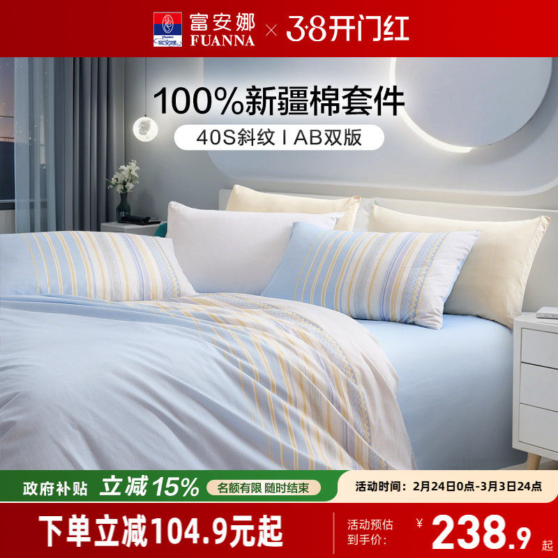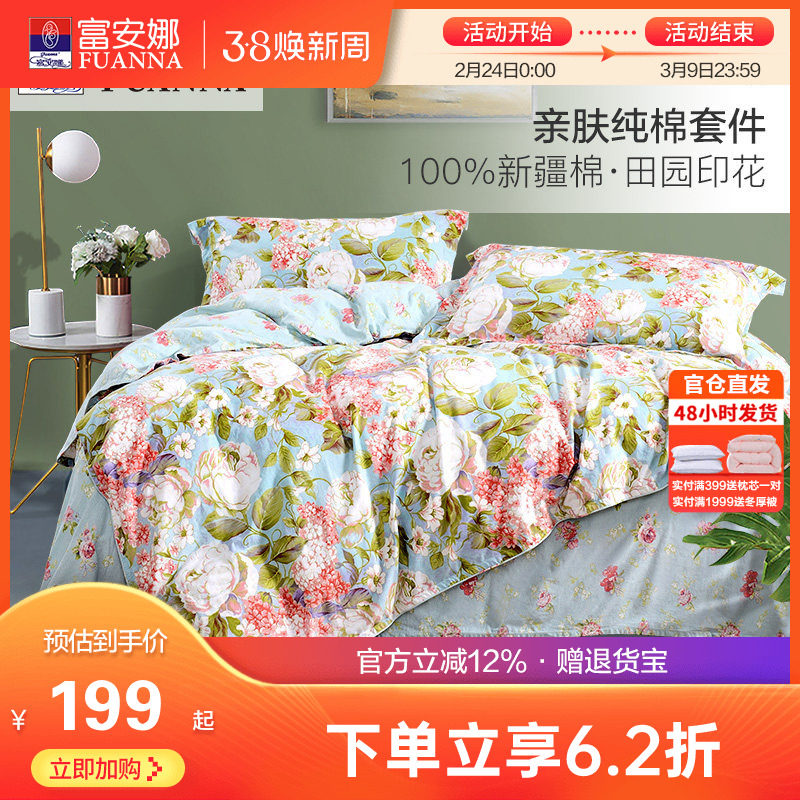 富安娜床上套件全棉纯棉四件套中性床罩100床单被套夏季床上用品