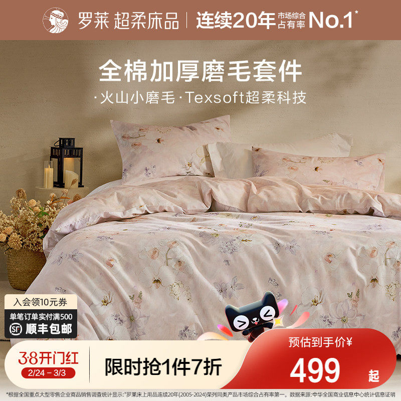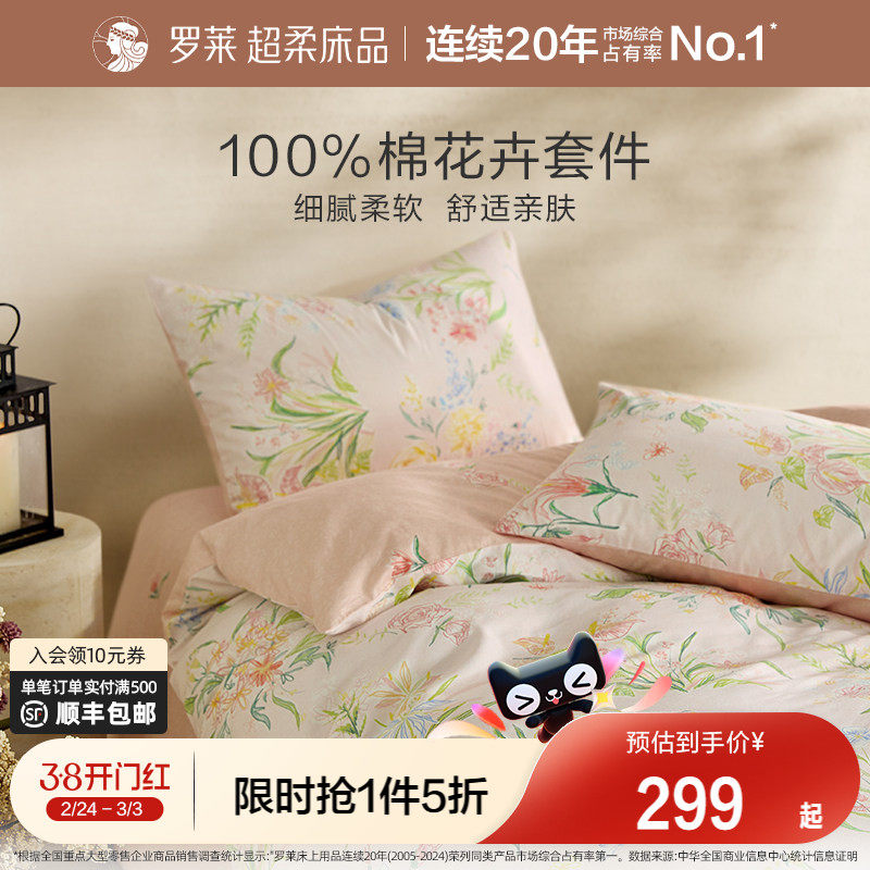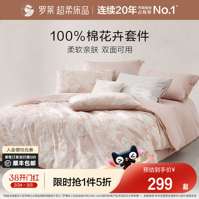 罗莱家纺全棉纯棉套件三件套床单被套被罩1.8m双人床四件套送礼
