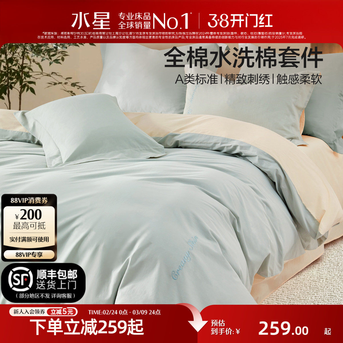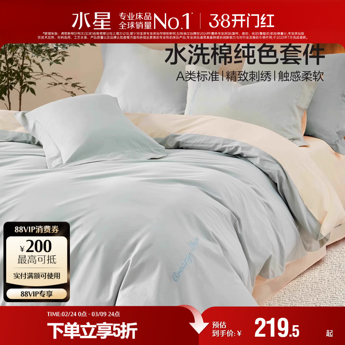水星家纺A类全棉水洗棉四件套纯棉素色简约套件家用被套床单床品