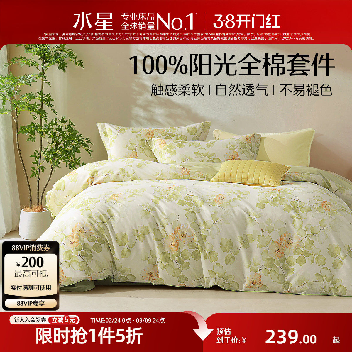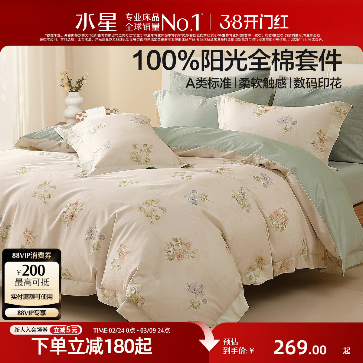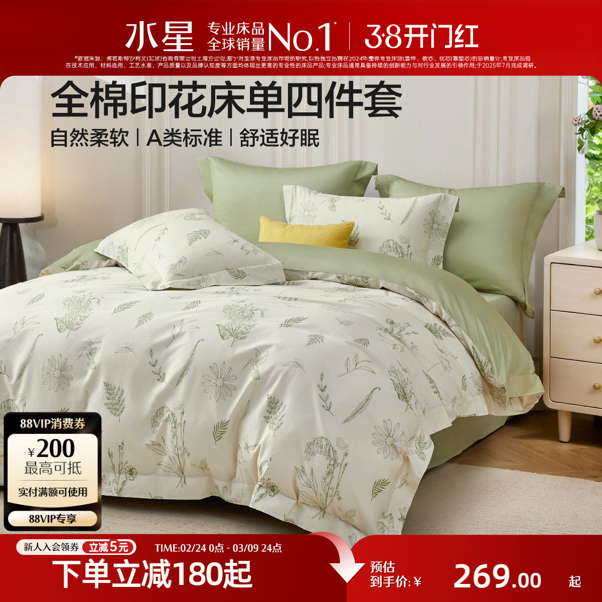 水星家纺床品全棉四件套纯棉印花套件家用田园风床单被套26年新品