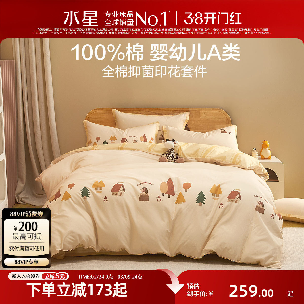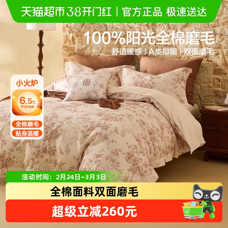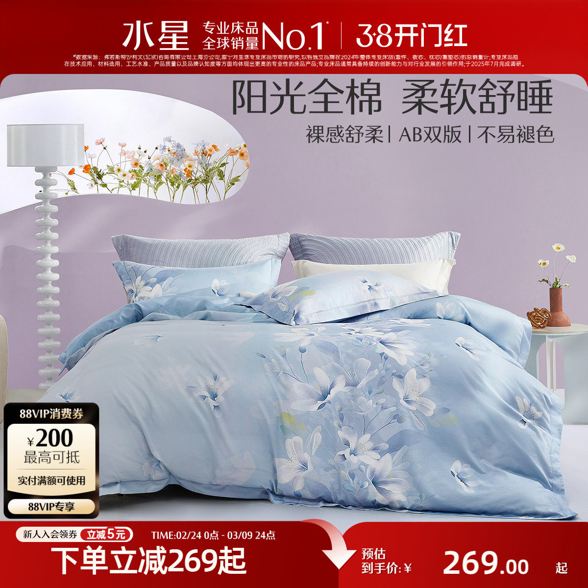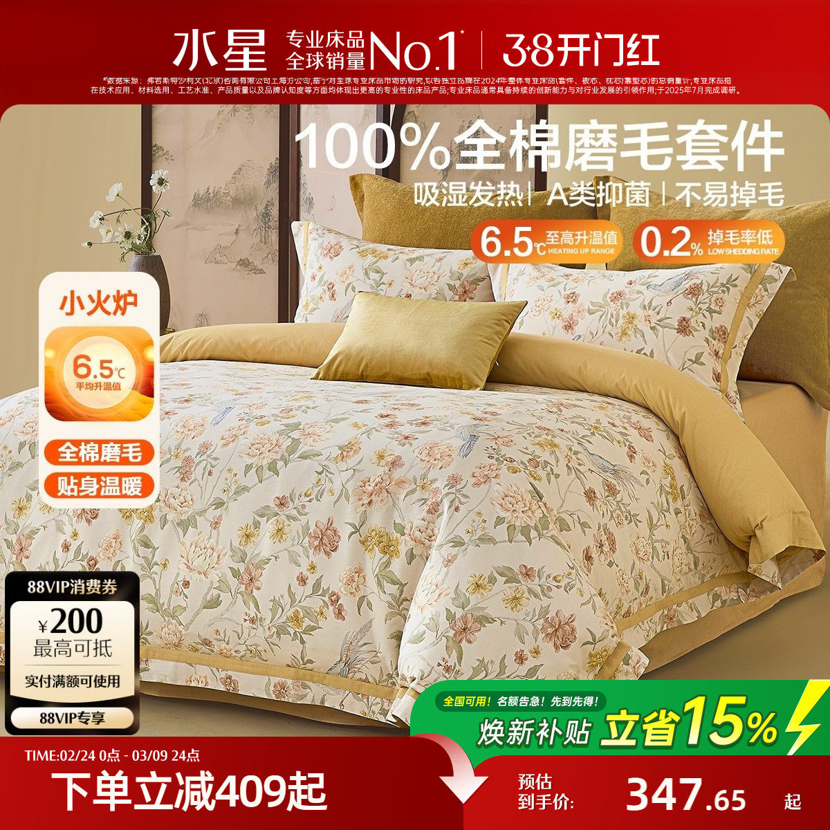 水星家纺全棉磨毛套件裸睡A类抑菌四件套纯棉印花被子套床单床品
