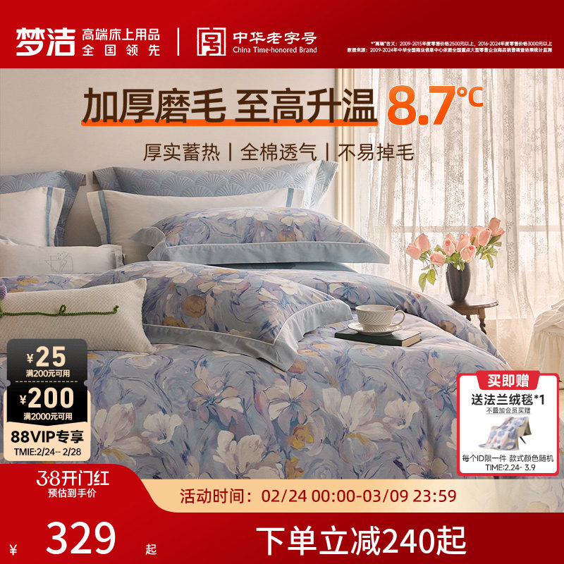 梦洁家纺全棉双面磨毛四件套纯棉保暖套件床品秋冬季床单被套礼物