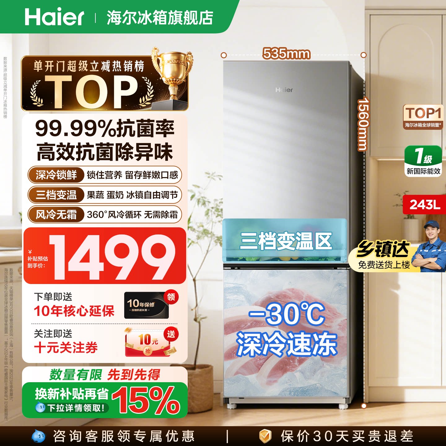 【金属底板】海尔小冰箱243L上下双开门一级变频风冷无霜官方正品