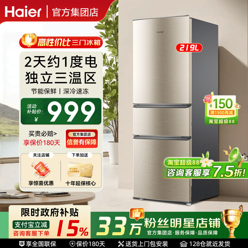 海尔三门家用节能小型电冰箱双门182升大容量219升租房官方旗舰