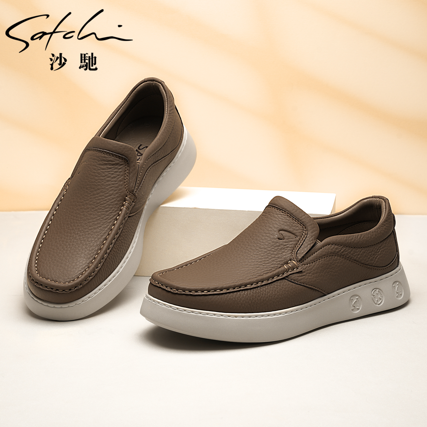 沙驰男鞋2025秋新款舒适软皮平跟休闲皮鞋棕色真皮男生极简乐福鞋