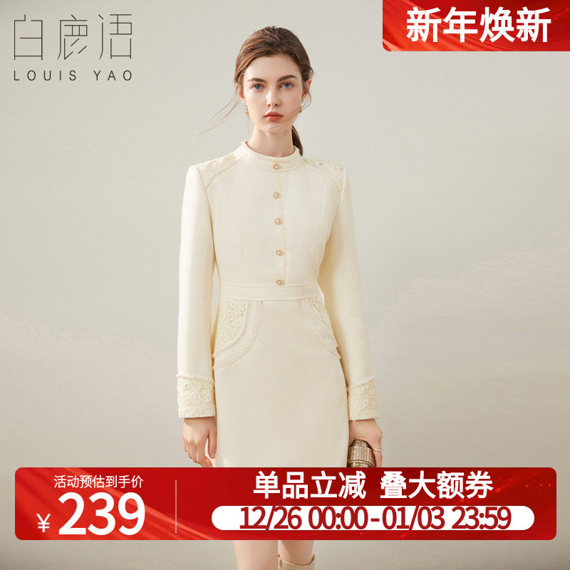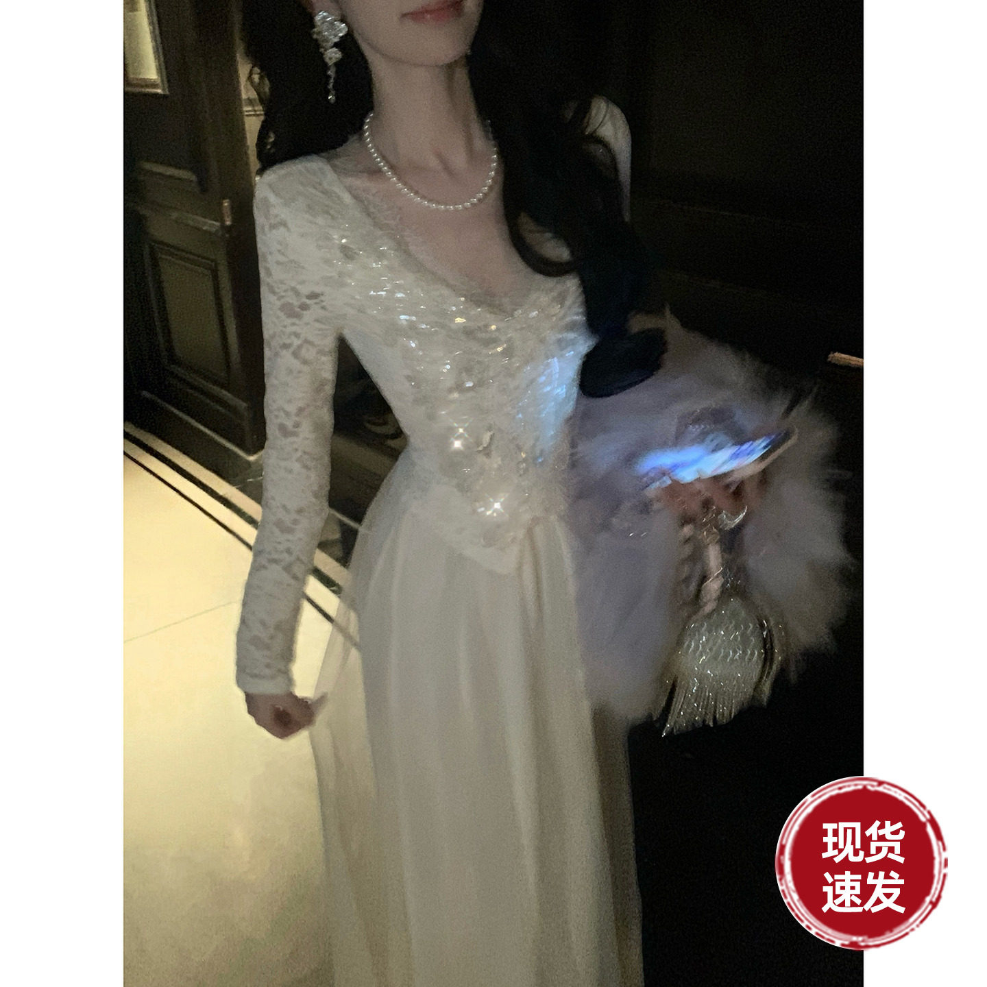 白鹿语法式钉珠拼接蕾丝裙2025秋冬新款优雅设计感收腰长袖连衣裙