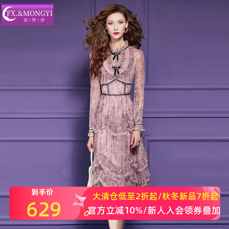 菲梦伊钉珠蕾丝紫色连衣裙女秋季轻熟名媛气质女人味修身包臀裙子