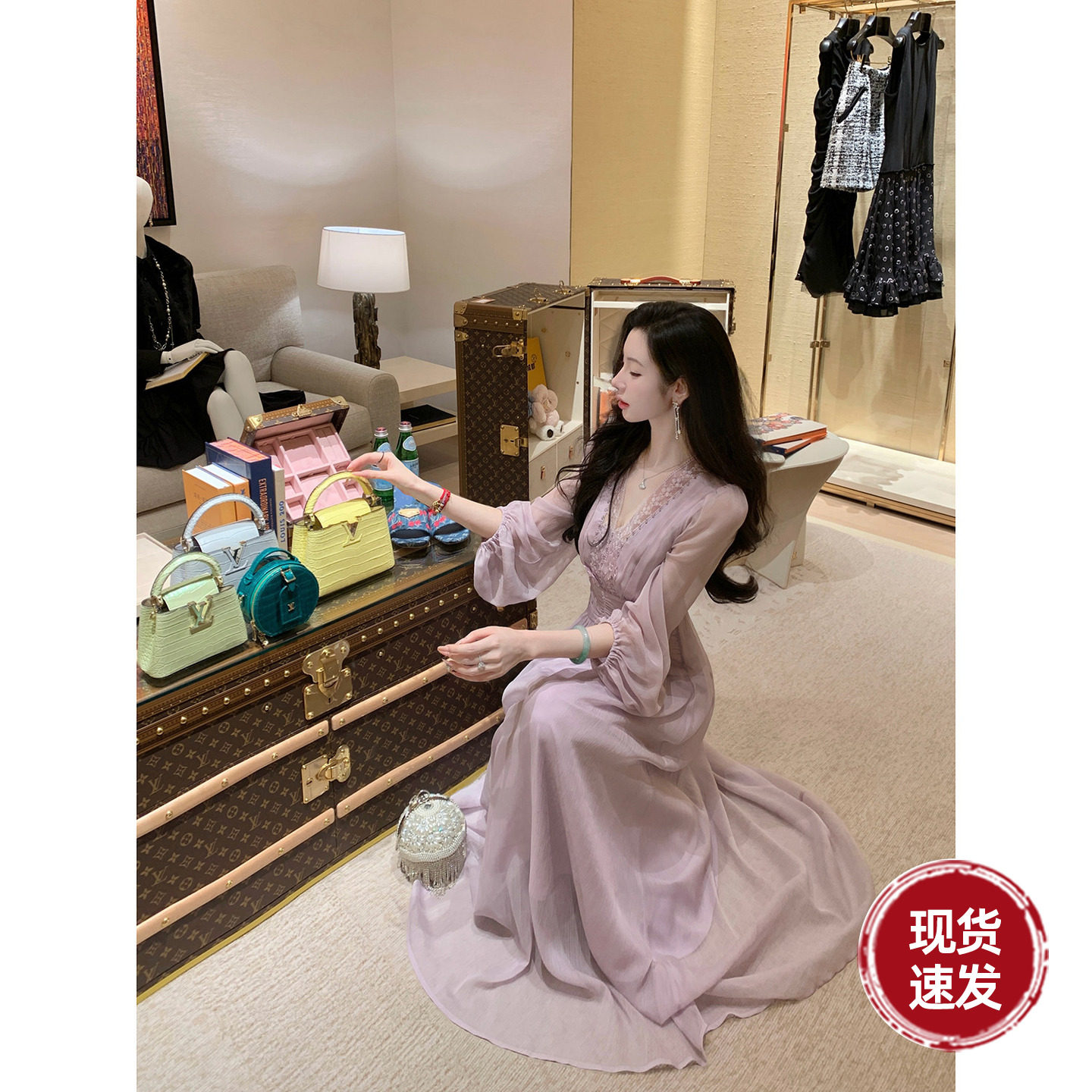 Sun雅乔【气质名媛】秋季新款长袖紫钉珠蕾丝V领复古灯笼袖连衣裙