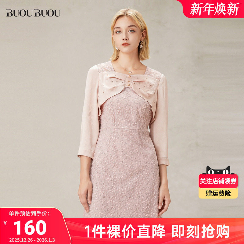 Buou Buou法式设计感钉珠七分袖蕾丝连衣裙女DI2G021