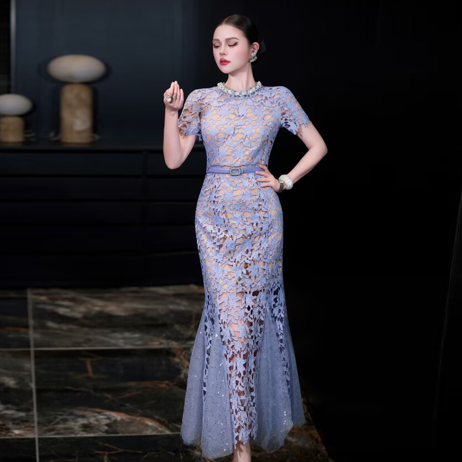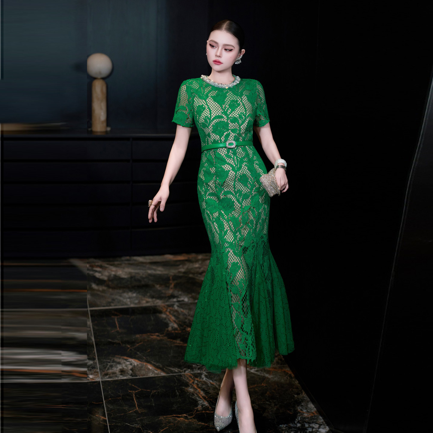 2026年早春时尚优雅晚宴风重工钉珠蕾丝连衣裙修身显瘦包臀鱼尾裙