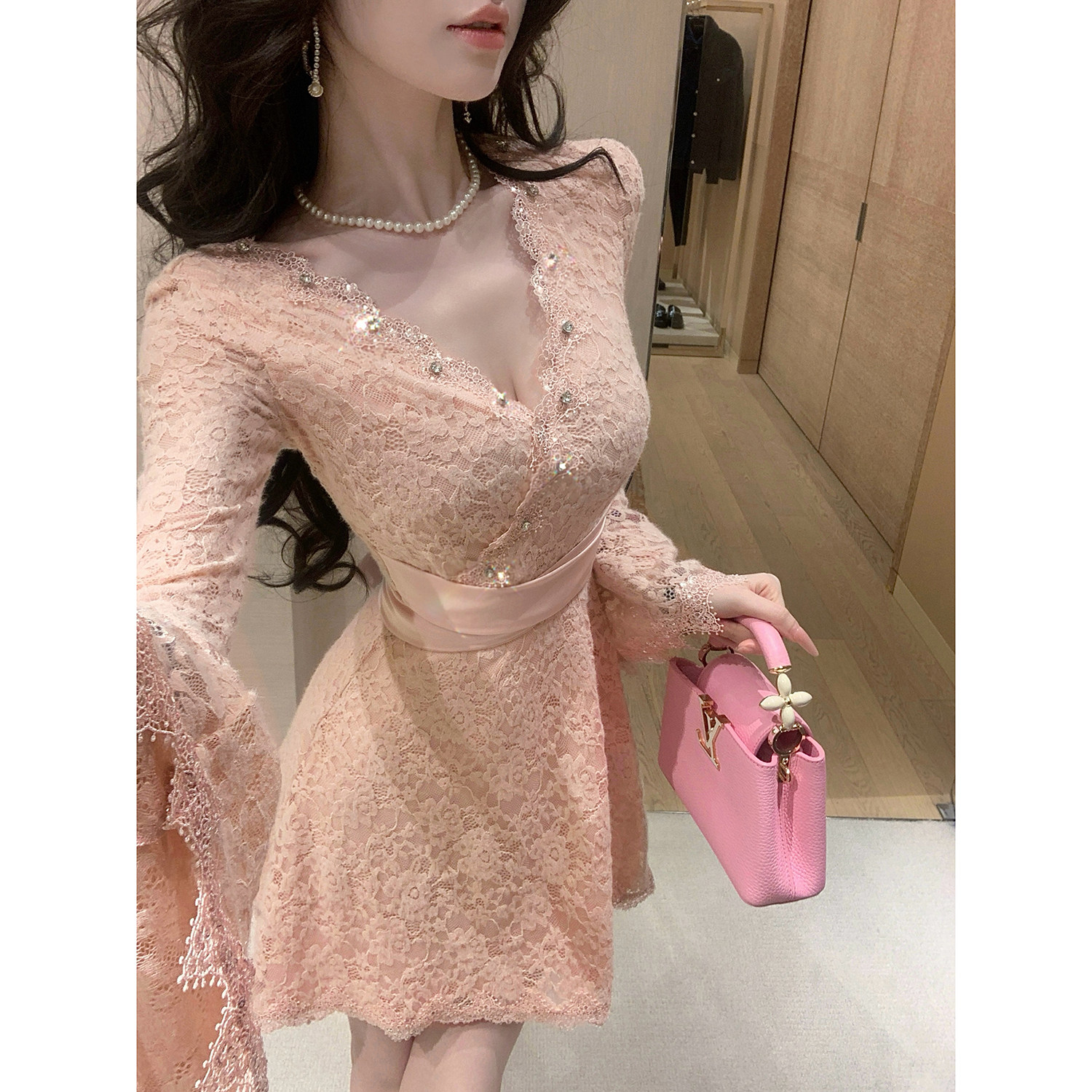 Sun雅乔【甜桃娇娇】秋冬名媛辣妹优雅气质V领钉珠蕾丝长袖连衣裙