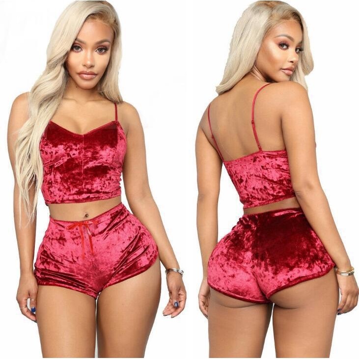 跨境外贸情趣内衣 欧美金丝绒性感女吊带短裤睡衣两件套T1797