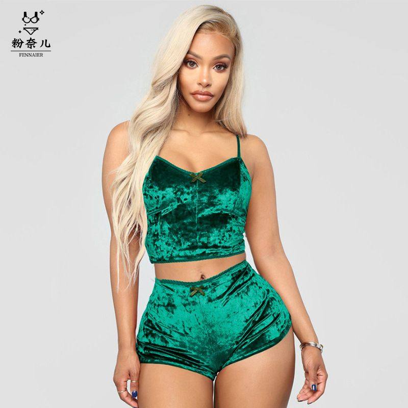 跨境外贸情趣内衣 欧美金丝绒性感女吊带短裤睡衣两件套装家居服
