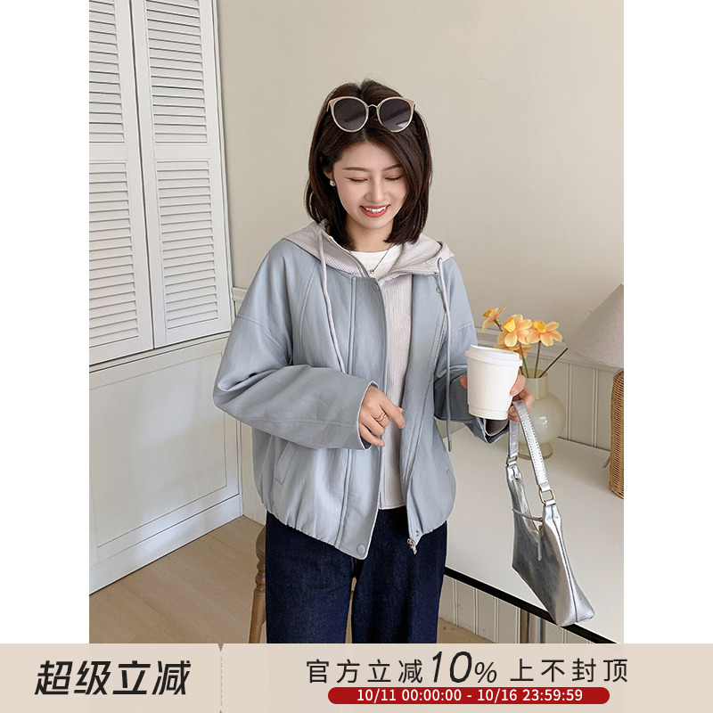紫璐莱春雅轻衣~韩系减龄假两件针织拼接连帽拉链皮衣短款外套50X