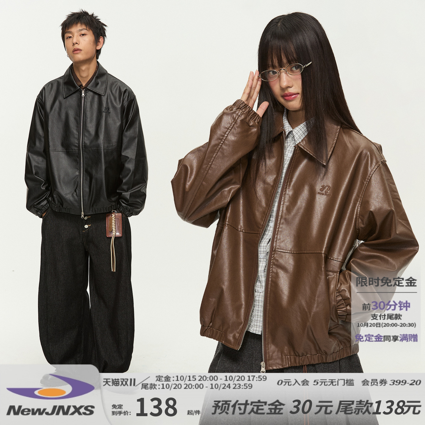 江南先生NewJNXS复古翻领双开拉链皮衣夹克男女休闲logo刺绣外套